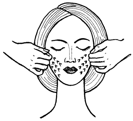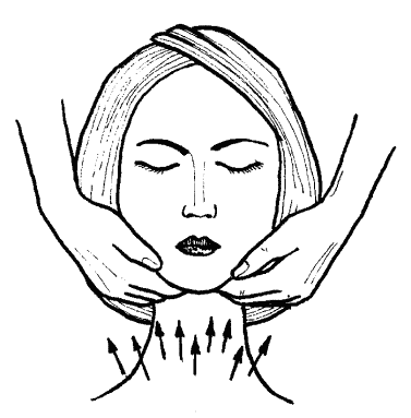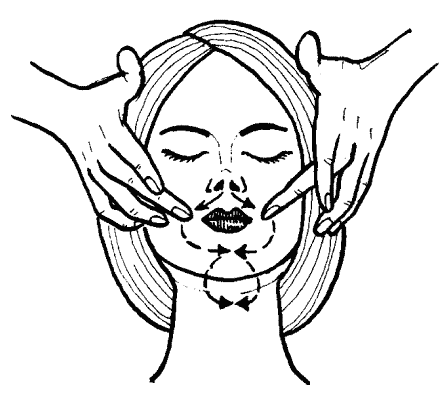 Первое направление – от верхней губы и подбородка. Перемещай пальцы так, чтобы они заходили за среднюю линию, причем указательные пальцы расположи на верхней губе, средние – в подбородочной ямке, а безымянные и мизинцы – под подбородком.