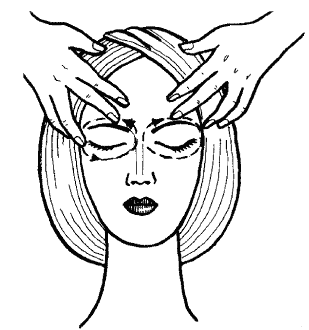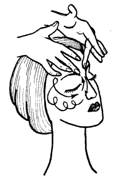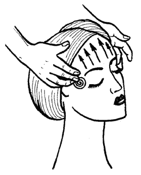 11. Зигзагообразное растирание лба. Пальцами левой руки фиксируй кожу височной области слева. Концами пальцев правой руки растирай лоб зигзагообразными движениями. Растирание это проводи от левой височной впадины к правой.