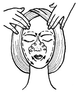 После этого выполни растирания по направлению к углам рта и по верхней губе. Затем, не отрывая пальцев, продолжай делать массирующие движения по направлению к крыльям носа. Такими же круговыми движениями растирай и боковые поверхности носа.
