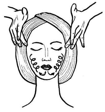 13. Растирание нижней части подбородка и щек. От середины подбородка выполни растирание круговыми движениями по направлению к ушной мочке (рис. 10).