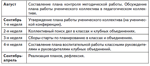 – предварительное планирование жизнедеятельности классного (школьного) сообщества на новый период с ученическим и родительским активом и администрацией массового общеобразовательного учреждения, с которым установлены контакты или заключен договор о сотрудничестве;