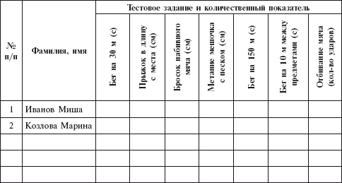 Врач заранее определяет детей, которые будут отстранены от выполнения тех или иных тестовых заданий по состоянию здоровья. Инструктор по физической культуре в процессе диагностики заполняет протокол обследования, в котором фиксируются количественные показатели, характеризующие уровень сформированности физических качеств, и качественные показатели, характеризующие степень сформированности двигательных навыков (таблица 1).