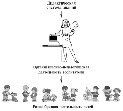 Прогрессивное значение использования системно-структурного подхода в дидактическом процессе разработки содержания обучения дошкольников заключается в том, что он может быть по-разному задействован в этой процедуре. В работе Н. Н. Кондратьевой центральным звеном является система знаний, ведущую роль в которой играют иерархически упорядоченные обобщения. Усвоение дошкольниками этой системы становится началом формирования у них навыков соответствующего поведения. Можно предположить другой подход: дидактическая система знаний сопряжена с различными видами деятельности детей. В этом случае усвоение эмпирических знаний системы, включенных в деятельность, может начаться в младшем дошкольном возрасте. Большая роль отводится педагогу, который целенаправленно организует детскую деятельность и наполняет ее элементами системных знаний. Такой подход соответствует положениям, выдвинутым А. В. Запорожцем по применению системно-структурного анализа в дошкольной педагогике. Его итогом будет синтез трех компонентов: дидактической системы знаний, организационно-педагогической деятельности воспитателей и разнообразной детской деятельности (рис. 1), что в целом обеспечит более раннее, чем в исследовании Н. Н. Кондратьевой, начало формирования осознанно-правильного (действенного, гуманного, бережного) отношения детей к природе. Именно такой подход осуществляется в нашем исследовании.