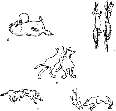 а – одиночная манипуляционная игра молодого барсука с шариком; б – совместные локомоторные игры белок; в – игровая борьба волчат; г – ролевые игры молодых волков – «совместная охота»: в игре происходит смена ролей – «жертвы», «преследователя», «затаившегося в засаде охотника»