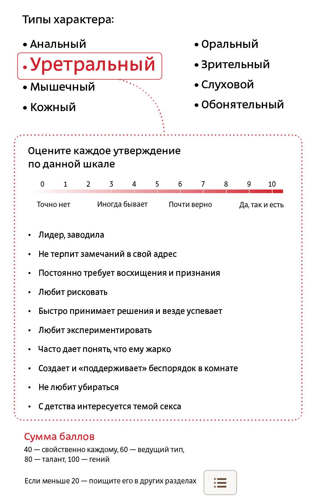 Поскольку не заметить их совершенно невозможно, об этих природных «вожаках» Зигмунд Фрейд также упоминает в статье «Характер и анальная эротика». Как мы помним, статья посвящена в основном анализу анального типа эротизма, однако в самом конце – и это можно считать гениальным озарением Фрейда – мимоходом отмечено: «Следовало бы вообще обратить внимание и на другие типы характеров и выяснить, нет ли в иных случаях связи с определенными эрогенными зонами. Мне лично до сих пор бросилось в глаза только то, что субъекты, страдающие недержанием мочи, отличаются непомерным, пламенным честолюбием». Викт?ру Толкачеву принадлежит описание физиологии уретрального типа характера, которое мы хотели бы процитировать: «Среди нас существуют люди, одаренные удивительной соматической особенностью: мочеиспускательный канал (уретра) у этих людей обладает очень высокой чувствительностью. Такой высокой, что в процессе мочеиспускания они испытывают острые эмоциональные впечатления, по силе соизмеримые с оргастическими. Конечно же, эту свою особенность такие люди обнаруживают еще в очень раннем детстве. Именно тогда появляется бессознательная привычка любым образом накапливать мочу и в момент ее „залпового сброса“ испытывать почти оргастические удовольствия». Так на телесном уровне проявляет себя особый тип энергии, который реализуется и в поведенческих стереотипах, буквально с первых месяцев жизни ребенка.
