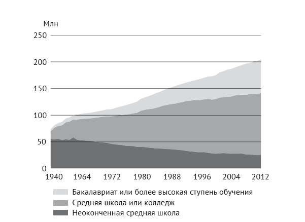 Рис. 1. Численность населения США с наиболее высоким уровнем образования, 1940–2012 гг.