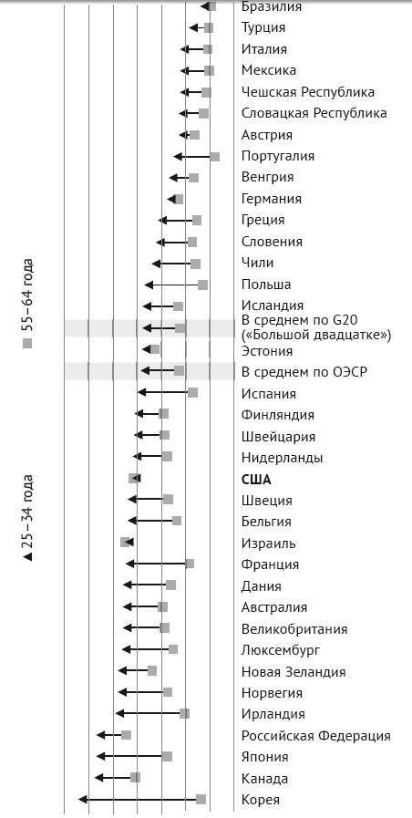 О застое в образовательной подготовке свидетельствуют также результаты сопоставления данных по странам ОЭСР о доле студентов, успешно окончивших бакалавриат, по разным поколениям. И хотя более молодые возрастные когорты в большинстве стран ОЭСР опережают предыдущие поколения по уровню образовательной подготовки, в США эта разница составляет менее 1 процентного пункта, что дает тревожный сигнал об отсутствии прогресса (рис. 9)[160]. «Лишь 30 % взрослых американцев достигли более высокого уровня образования, чем их родители», – констатирует экономист Эдуардо Портер, ссылаясь на данные недавнего исследования. Причем «среди молодежи в возрасте 25–34 лет более высокого уровня образования по сравнению со своими родителями достигли лишь 20 % мужчин и 27 % женщин». Если же в этой возрастной группе взять только тех индивидов, чьи родители не окончили среднюю школу, то степень бакалавра получил лишь один из 20[161]. «Очевидно, что Соединенные Штаты более не являются мировым лидером в области образования молодых взрослых», – отмечают Голдин и Кац[162].
