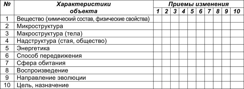 Частным случаем метода морфологического анализа является метод фантограмм. Как предложено Г. С. Альтшуллером, это систематический перебор всех возможных для данного факта изменений. Для проведения такого перебора предложена таблица – фантограмма (см. табл. 1): по вертикали откладывают различные структурные особенности реального объекта, по горизонтали – основные приемы преобразования идей, приведенные выше. Заполняя поочередно клетки таблицы, можно производить изменения не только самого объекта, но и многих его характеристик. В таблице 100 клеток, значит, можно получить столько же новых идей или значительно больше, если пользоваться сразу несколькими приемами или изменять несколько характеристик. Не все сочетания эффективны, большинство из них неинтересны, но последовательный перебор позволяет не пройти мимо новых идей. Для начала пробуют лишь некоторые комбинации.