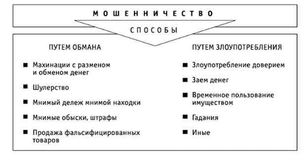 Все способы мошенничества (рис. 8.1) можно разделить на два вида: совершенные путем обмана и путем злоупотребления доверием.