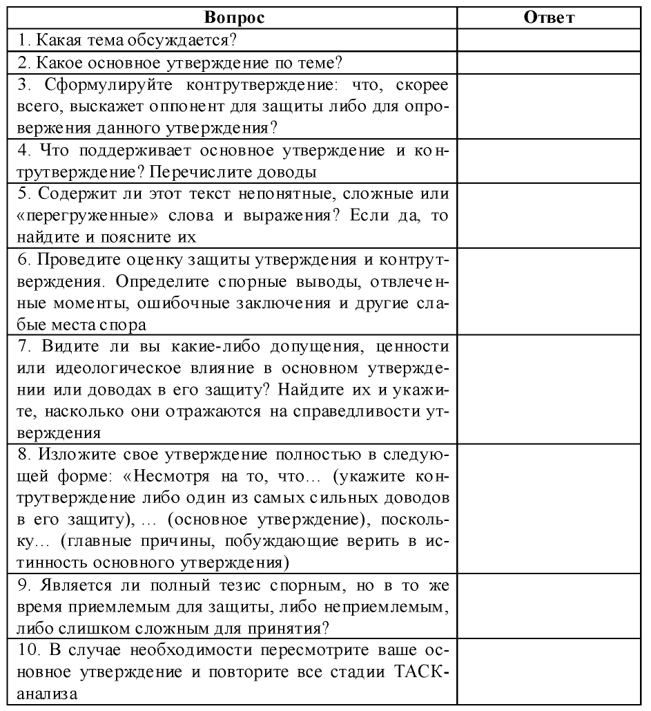 ТАСК – расшифровывается как тезис – анализ – синтез – ключ. Его назначение – помочь обучающимся научиться независимо размышлять об отдельных фрагментах текста. Этот метод представляет собой 10 последовательно заданных вопросов, на которые предстоит ответить в ходе чтения текста. Наиболее рациональный прием – внести вопросы и ответы в таблицу (таблица). Здесь важно умение вычленять тезисы и антитезисы текста.