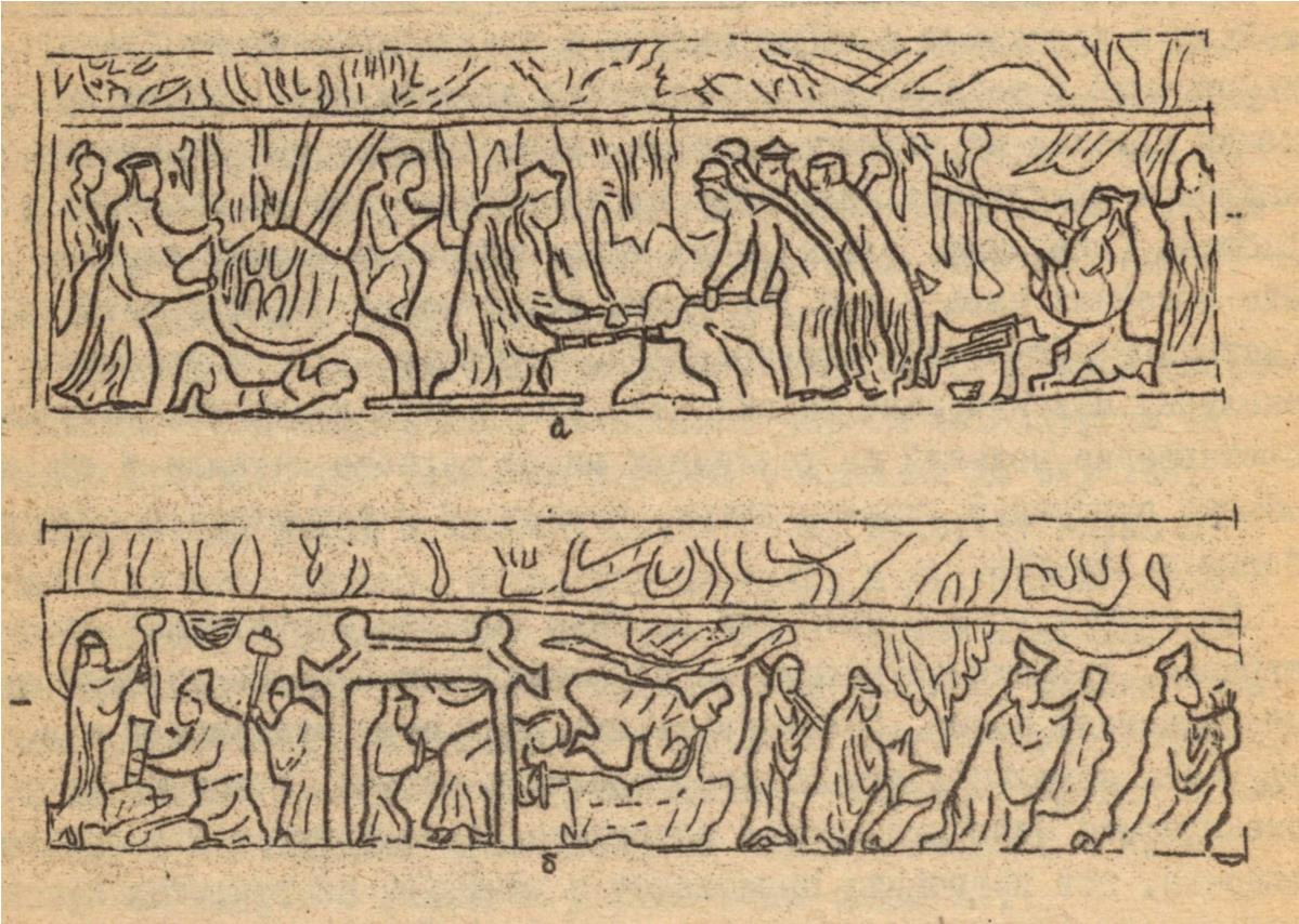 Рис. 3. Сцены металлургического производства. Прорись рельефа из восточноханьского погребения в пров. Шаньдун (I–II вв. н.э.). Фрагмент а: слева – работа мехами; в центре – заливка формы сосуда под руководством мастера; справа – кузнец оружейник (?). Фрагмент б: слева – горнорудные разработки; в центре пудлингование чугуна(?)