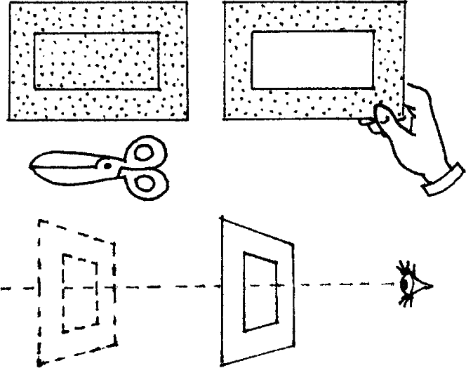 Гибкое (временное) зонирование создаёт условия для уединения и объединения детей по интересам, помогает улучшить работу с детьми. Приёмы визуального зонирования позволяют педагогу и детям, к примеру, методом визирной рамки «фотоаппарата» (см. рис.) и других приёмов обогащения восприятия композиционно выделять (зонировать) в интерьере и на пленере объекты эстетического любования (настенный декор, фрагменты одежды и праздничного убранства, изменения пейзажа, узор листвы и т. п.). Визирная рамка (фотоаппарата) выполняется из листа плотной бумаги, картона, пластика (8 ? 12 см), в середине которого вырезается отверстие (3 ? 4 см).