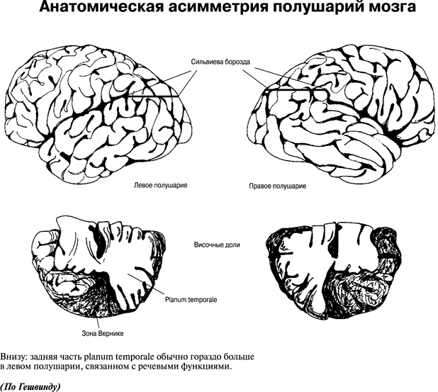 В настоящее время получено большое количество данных о неравнозначности левого и правого полушарий головного мозга. К ним относятся анатомические и физиологические данные, а также материалы наблюдений за больными, имеющими сходные поражения левого и правого полушарий (рис. 4).
