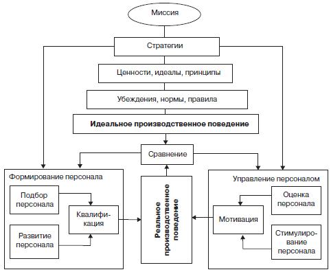 Через ценности, идеалы и принципы отношений формируется модель идеального производственного поведения – основа «мягкого» метода управления персоналом (рис. 1.4). Стратегия управления персоналом реализуется как через менеджмент ресурсов – формирование необходимого кадрового потенциала, так и через менеджмент организации – мотивация персонала (рис. 1.5). При этом миссия позволяет преодолеть апатии состоявшихся (успешных) компаний, накопивших первичный капитал и удовлетворивших свои гигиенические потребности. Она вносит стратегический смысл (предназначение) в деятельность таких компаний, порождает амбициозные стремления к совершенству и становится, таким образом, платформой мотивации дальнейшего развития.