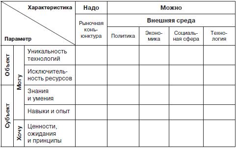 1) компании (самоидентификация) – как субъекта (знания, опыт, ценности, ожидания, принципы) и как объекта (ресурс, технологии);