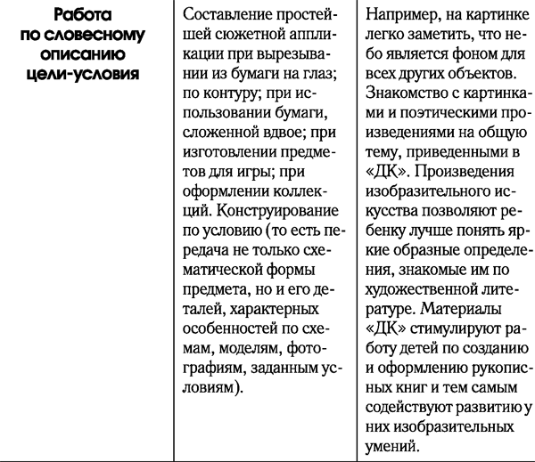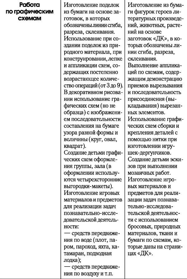 В старшем дошкольном возрасте в продуктивной деятельности ребенка появляется конкретная цель-замысел. Дети способны последовательно работать над материалом, используя различного рода символические посредствующие звенья между замыслом и целью: словесное описание условий, которым должен соответствовать продукт, образцы и графические модели. Дети фиксируют внимание на конечном результате работы: его демонстрируют (если он удовлетворяет) или уничтожают (если он чем-то не удовлетворяет). Расширяется диапазон возможностей преобразования материала, ребенок овладевает широким спектром специфических навыков работы с определенными материалами и инструментами.