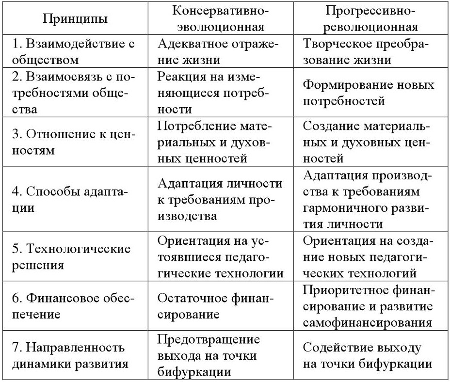 Как видно из таблицы 1, прогрессивно-революционная модель развития образования отражает чаяния многих педагогов и особенно актуальна для настоящего периода развития общества.