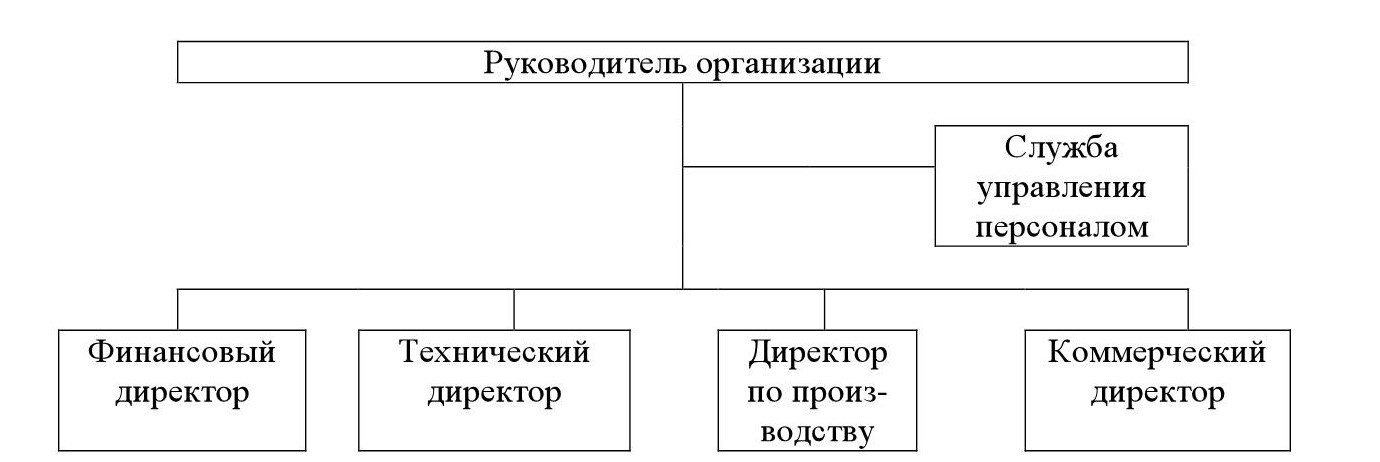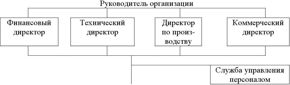 Вариант 2: служба управления персоналом в качестве штабного отдела структурно подчинена общему руководству организации. Преимуществом является близость ко всем сферам руководства организации. Наиболее целесообразна такая структура для небольших организаций на начальных этапах их развития, когда руководство еще четко не определило статус кадровой службы. Однако следует исключить при таком варианте опасность множественной подчиненности противоречивым указаниям (рисунок 4).