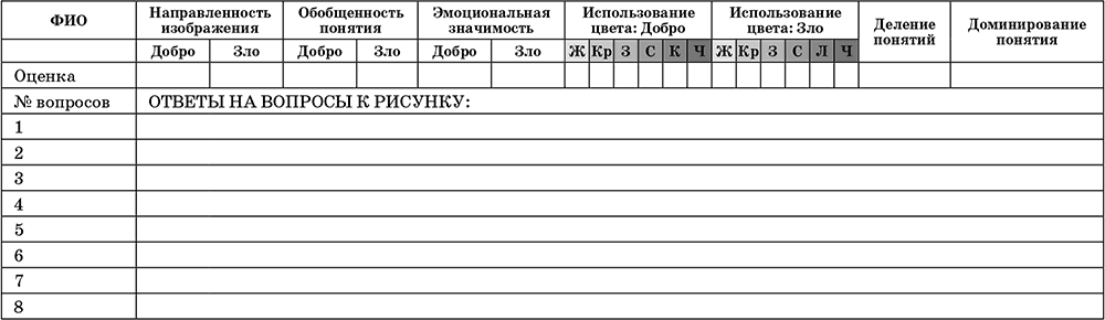 Противопоставление понятий (в баллах): 4 – общий рисунок, иллюстрирующий Добро и Зло во взаимодействии; 3 балла – понятия разделены на листе или изображены на разных листах; 2 – понятия изображены отдельно, но без деления листа; 1 – изображено только одно из понятий или оба понятия не связанные по смыслу.