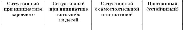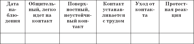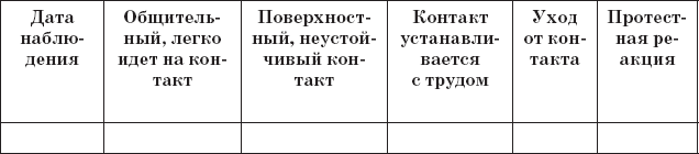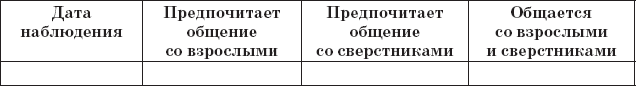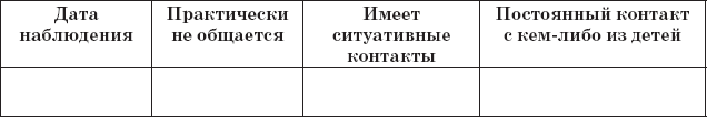 3. Для изучения особенностей взаимодействия ребенка со сверстниками (контактность, наличие общения, положение в группе сверстников, характер общения) результаты наблюдений отмечаются в табл. 7, 8, 9, 10.