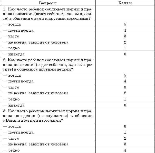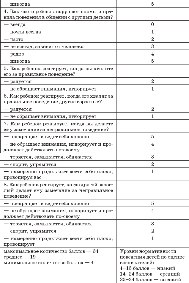 Оценку нормативности поведения ребенка позволят сделать и результаты анкетирования. Предлагаемые варианты анкет для педагогов позволяют получить информацию о поведении ребенка при выполнении (или нарушении) норм и правил, его реагировании на санкции взрослых, и тем самым дополняют представления о процессе социализации ребенка.