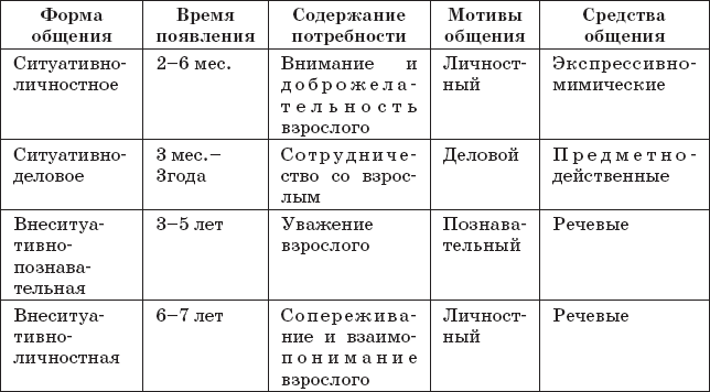 В дошкольном возрасте ребенок проходит несколько стадий развития общения со взрослыми и со сверстниками, представленных в таблице 16 [3].