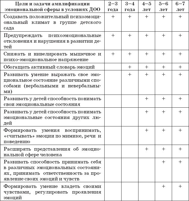 Следовательно, амплификация эмоционального развития дошкольника может осуществляться через обогащение содержательных (переживания, знания) и инструментальных (выражение) компонентов эмоциональной сферы посредством направленных психологических воздействий [Изотова, 2014].