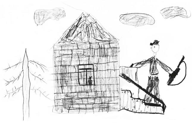 В рисунке дома привлекают внимание повторяющиеся мелкие детали, окно мальчику пришлось рисовать уже после того, как была нарисована кирпичная стена. У дома отсутствовала труба, боковая дверь открыта, но изображенный на крыльце человек не может в нее войти, так как слишком велик. Части тела человека соразмерны, он одет в военную форму, вооружен, ладони закрашены черным. Уши отсутствуют. Он стоит на крыльце, скрытый перилами, как забором, имеет зачерненную линию основы – эти детали свидетельствуют о незащищенности автора рисунка. Фоном для фигуры стали облака на небе, что указывает на боязливость, тревогу, опасения.