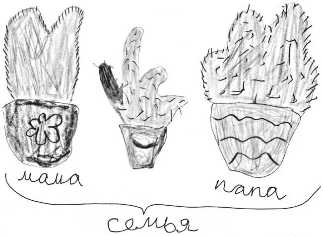 Алеша нарисовал сначала один кактус в горшке в самом центре листа. Это «радостный» кактус, он открыто улыбается. В рисунке использованы яркие цвета: два тона зеленого, розовый, голубой, оранжевый. Короткие иголки на кактусе были нарисованы в самую последнюю очередь, часть их не торчит, а стелется по поверхности растения. Кактус имеет довольно вычурную форму с выступающими отростками. Эти детали говорят о демонстративности, которая, несомненно, есть в характере мальчика. Но в то же время в рисунке почти отсутствуют детали, указывающие на агрессивность и тревожность. Изображение кактуса в горшке свидетельствует о чувстве семейной общности. Это чувство подчеркнуто желанием мальчика изобразить рядом еще два кактуса больших размеров, которые он назвал «мама» и «папа», а затем обвел все три изображения фигурной скобкой и подписал «семья». Очевидно, что изменение внутреннего климата в семье и поиск оптимальных условий для занятий помогли мальчику справиться с тревожностью, а это также дало возможность быть более успешным в школе.
