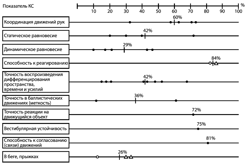 Уровень КС у детей школьного возраста, юных и квалифицированных спортсменов, как представляется, зависит от таких психических составляющих, как эмоционально-мотивационные (двигательная мотивация и испытываемая при этом радость от овладения теми или иными двигательными действиями), ценностно-ориентационные (предпочтение определенным видам двигательной активности), установочные (установка на точность, быстроту или экономичность выполнения движения), волевые (смелость, решительность, выдержка, самообладание). Сегодня мы можем лишь предполагать, что эти психические составляющие, как и вышеназванные психофизиологические функции, играют определенную роль в процессах управления двигательными действиями. Однако, каково их конкретное влияние на уровень КС детей дошкольного и школьного возраста – еще далеко не изученный вопрос возрастной психофизиологии движений (В. И. Лях, 2000).