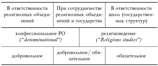 Другой не менее авторитетный источник – «Европейская карта межрелигиозного и ценностного образования», разработанная И. Ленеманном и П. Шрайнером[26], – делит существующие в Европе подходы к организации РО, на шесть типов: