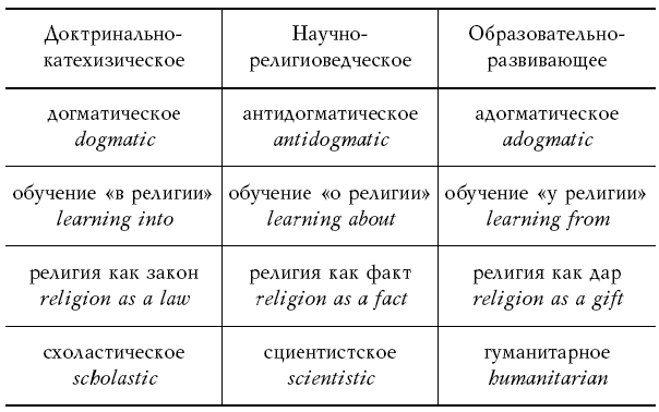 Выделенный Н. Смартом и М. Гриммитом «третий подход» получил в Англии определения «образовательного»[34] и «развивающего»[35] РО и в этом качестве был противопоставлен доктринально-катехизическому и научно-религиоведческому подходам. В отечественной науке идеи Смарта и Гриммита получили развитие в работах Ф. Н. Козырева, предложившего адаптированную русскоязычную версию парадигмальной типологии, включающую три подхода, при которых религия изучается в школе