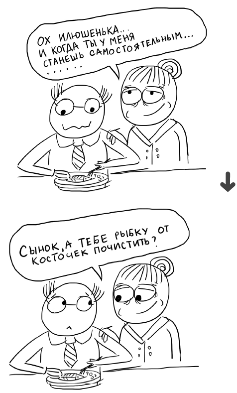 Я встречала людей, которые физически выросли, но при этом не стали взрослыми и самостоятельными. Не овладели навыком самоконтроля. Не приобрели способность принимать решения, брать на себя ответственность. Я знала школьников, чьи домашние задания до выпускного класса контролировали родители. Я работала со студентами, которые не знают, зачем учатся и чего хотят в жизни. За них все всегда решали родители. Я видела дееспособных мужчин, которых на прием к врачу приводили мамы, потому что сами мужчины терялись, где взять талон и в какой кабинет занять очередь. Я знаю женщину, которая в 36 лет одна, без мамы, в магазин за одеждой не ходит.