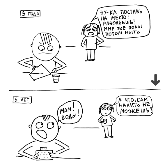 Всегда отзываться на просьбу ребенка о помощи и не отзываться принципиально – это две крайности. Еще раз: ситуации бывают разные. Важно чувствовать ребенка, чтобы понять, как поступить. За его просьбой могут стоять каприз, лень и даже проявление власти: «Как скажу, так и будет».