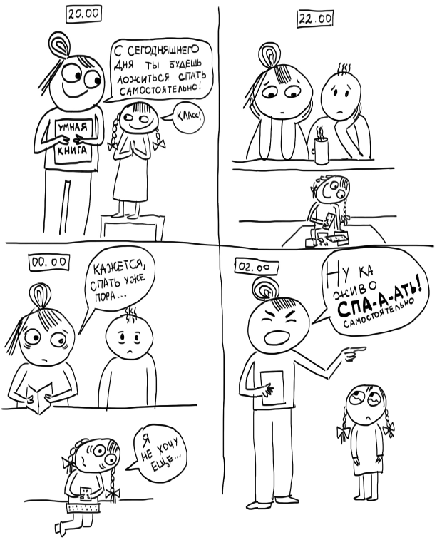 После девяти вечера начинается мое личное время. Дети могут спать, могут не спать, но это не влияет на мои вечерние планы. Если младший сын хочет, чтобы я почитала, – я почитаю, но только до девяти часов. В девять время чтения заканчивается. Если старшему нужна помощь с уроками, я готова помочь до девяти часов. Не хочешь спать – можешь играть. Но только тихо и в своей комнате при свете ночника, чтобы не мешать спать остальным. Тихо играть одному в полумраке довольно скучно, и ребенок быстро засыпает. У меня нет проблемы с укладыванием детей. И у меня есть своя жизнь. Мамино время. Даже если дети не спят.