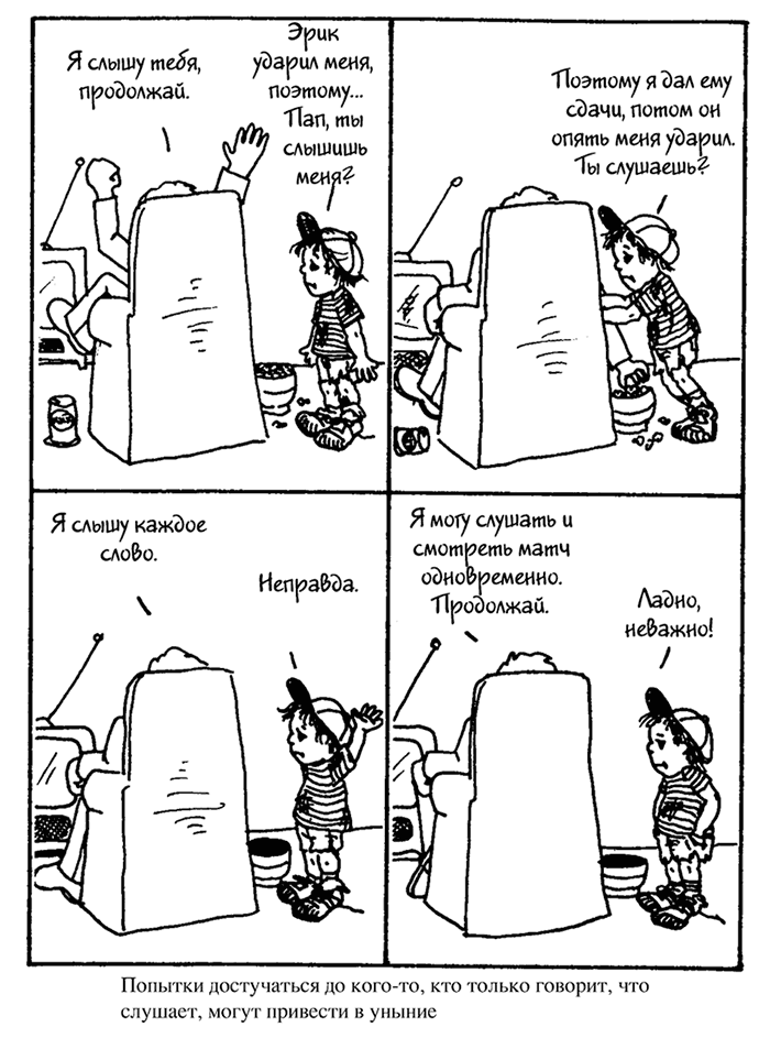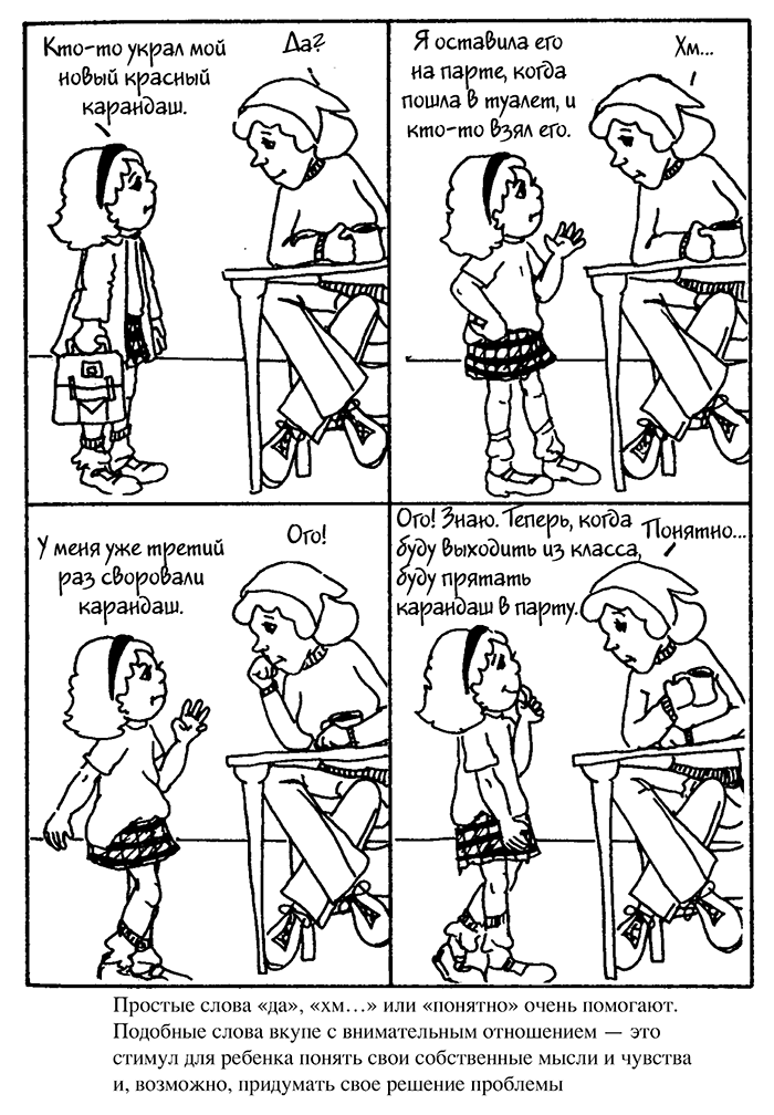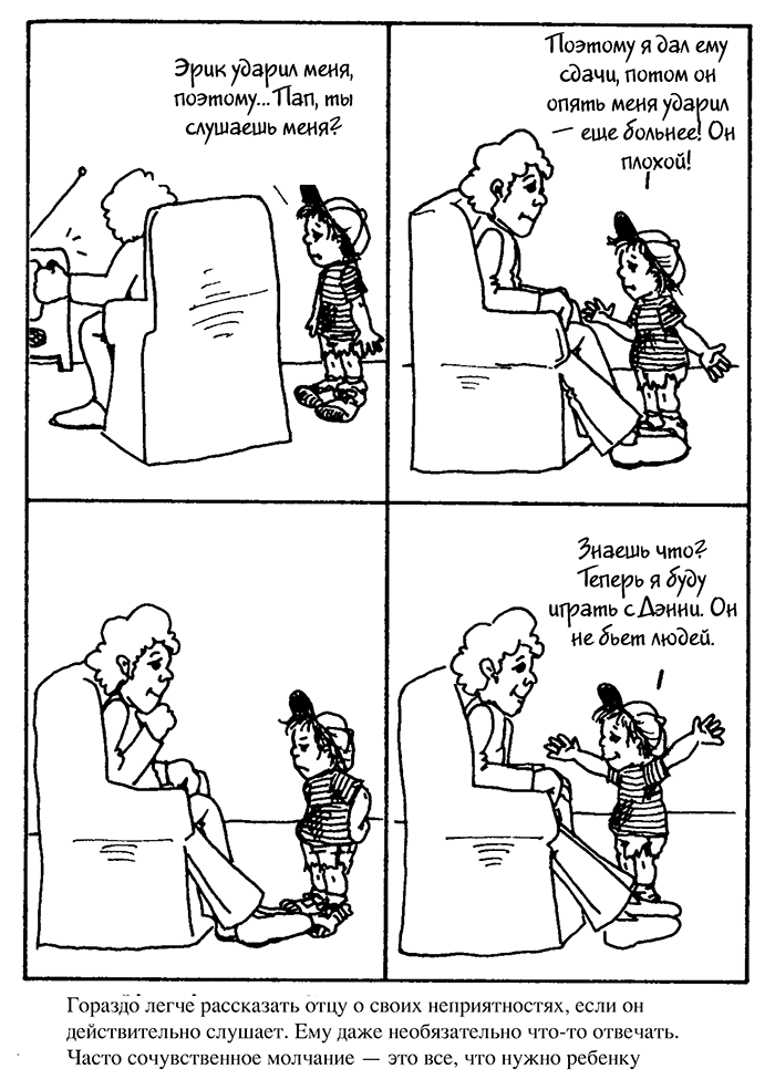 Отец был изумлен. Он не задавал вопросов, и все равно ребенок рассказал ему всю историю. Он не давал советов, и тем не менее ребенок придумал свое собственное решение. Ему показалось невероятным, что он так помог сыну, просто выслушав его и признав его чувства.