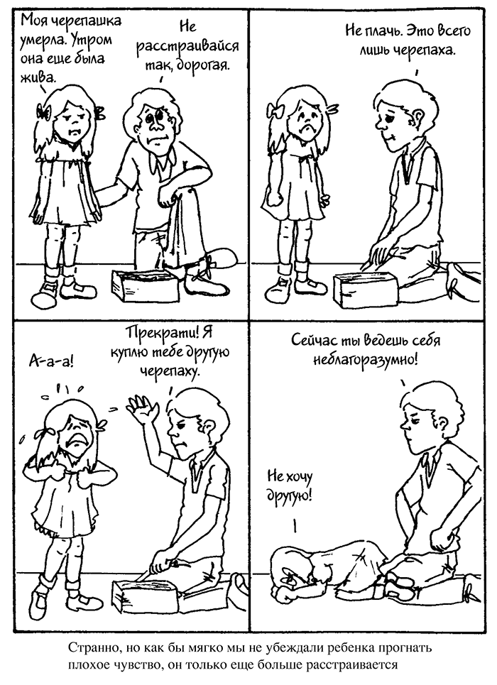 Далее, на рисунках, вы увидите контраст между этими приемами и тем, как обычно люди отвечают детям, если у них проблемы.