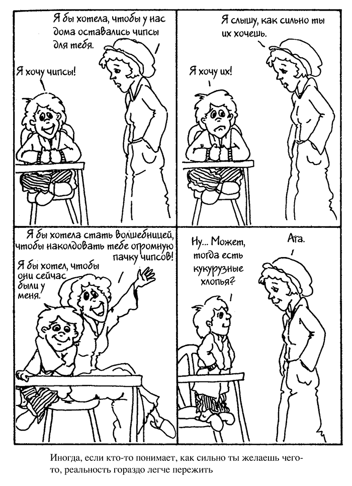 Следующие несколько недель я старалась настроиться на то, что мои дети могли, по моему мнению, испытывать, и когда я это сделала, мои слова, казалось бы, стали естественными. Я не просто использовала технические приемы. Я действительно имела в виду то, что говорила: «Так, значит, ты все еще чувствуешь себя уставшим, несмотря на то что ты только что дремал». Или: «Мне холодно, но тебе здесь жарко». Или: «Я вижу, тебя не особо интересует эта телепрограмма». В конечном счете мы были двумя разными людьми, способными иметь два разных набора чувств. Никто из нас не был прав или не прав. Каждый из нас чувствовал то, что чувствовал.