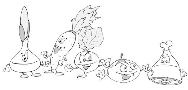 Тут к ним пришли Мясо и Лук, и Морковка их тоже раскрасила своим оранжевым цветом. Все были довольны и благодарили Морковку за доброту.
