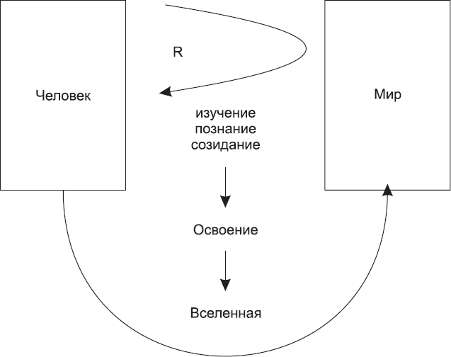 Человек изучает и познает окружающий мир, созидая образовательные продукты. В результате он осваивает внешний мир, вселяется в него. На основе рефлексии (R) происходит фиксация внешних и внутренних новообразований. Человек образуется внутренне; мир пополняется продуктами его деятельности.