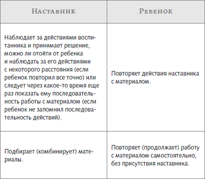 Урок наставника по применению того или иного материала ребенок получает не перед знакомством с материалом и не во время знакомства с ним, а уже после того, как по своему желанию осуществил попытку самостоятельно позаниматься с интересующим его пособием.