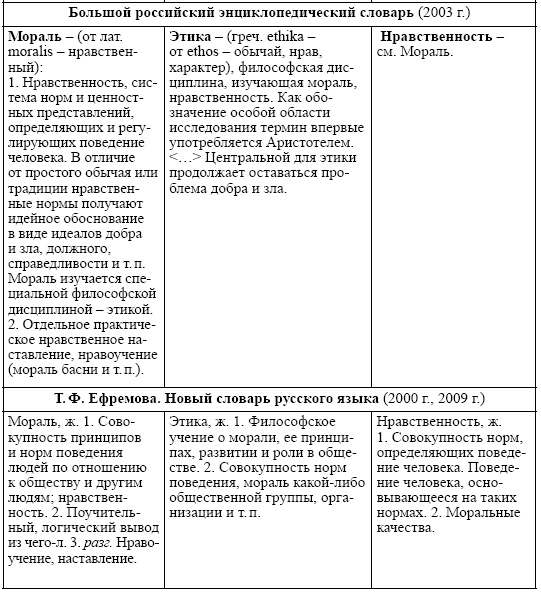 В энциклопедическом словаре Ф. Брокгауза, И. Ефрона предлагается толкование только слова этика как ключевого, определяющего мораль и нравственность, причем в статье приводятся различные моральные системы и говорится о добре и зле как основе человеческой деятельности [367].