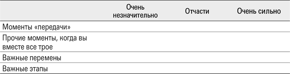В приведенной ниже таблице суммируются ситуации, в которых у вашего бывшего может усиливаться желание спровоцировать в ребенке конфликт лояльности. Поставьте галочку в соответствующем столбце, чтобы обозначить, насколько стрессовыми подобные ситуации обычно являются для вас.