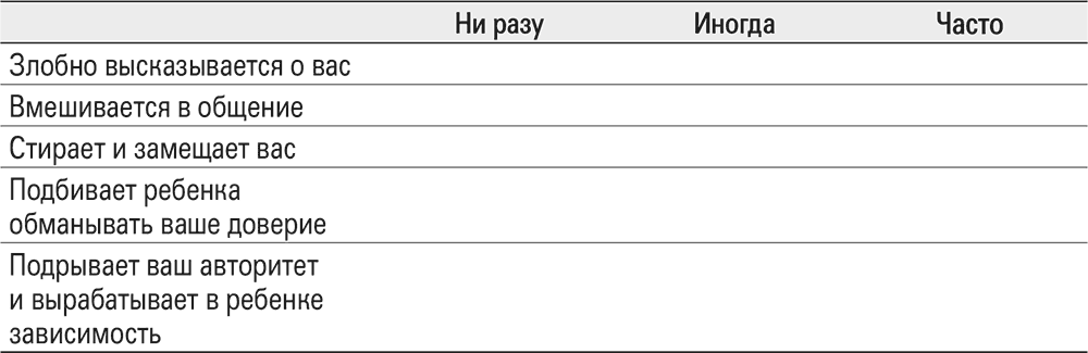 Подрывая ваш авторитет, другой родитель постоянно выступает против установленных вами правил и занижает в глазах ребенка вашу родительскую значимость. Он находит способы «спасти» ребенка от ваших правил, ограничений и наказаний, одновременно навязывая свои. Если ребенок всячески старается угодить вашему бывшему и строго следует его требованиям, какими бы непонятными и тяжелыми они ни были для него или вас, значит, ваш бывший привил ребенку желание угождать ему ценой всех других отношений. В результате вам будет все труднее и труднее оставаться для ребенка значимой фигурой. Как реагировать на то, что другой родитель подрывает ваш авторитет и формирует в ребенке зависимость, мы обсудим в главе 9.
