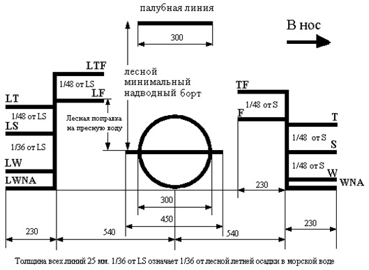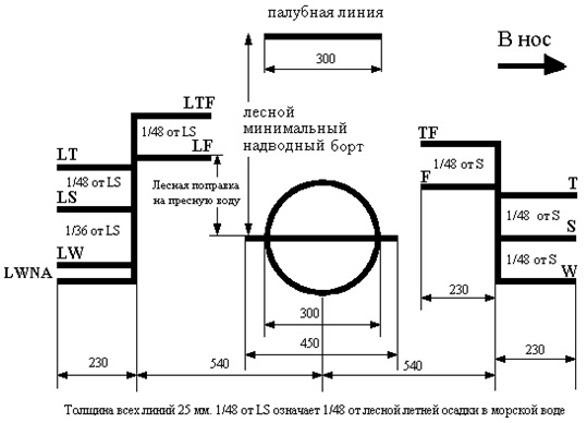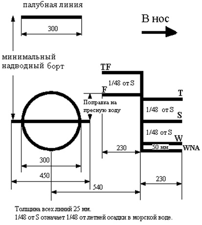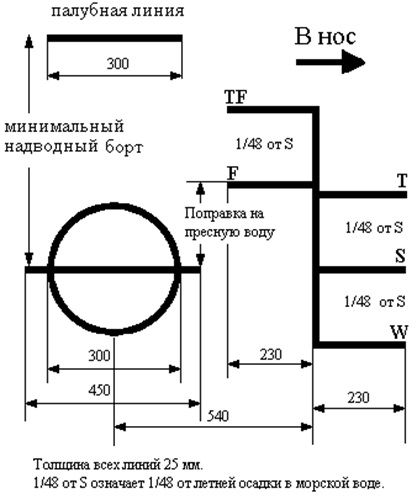 Рисунок грузовой марки представляет собой сочетание грузовой марки, марочной гребенки и палубной линии.