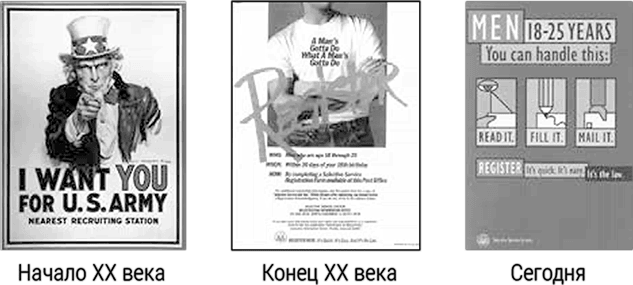 На этих трех плакатах из трех разных эпох в истории США наглядно видна эволюция отношения к мужчинам, которых мы просим умереть за нас: сначала мы их вдохновляли, потом – обязывали, а теперь презираем.
