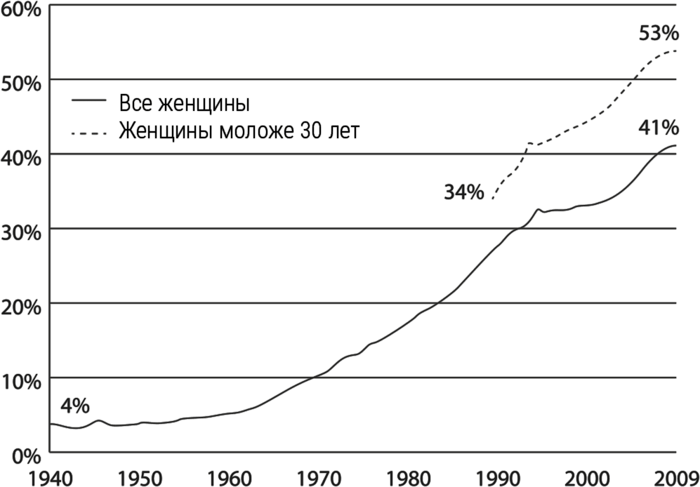 Впервые за всю историю США более половины детей, родившихся у матерей моложе 30 лет, рождены вне брака{225}.