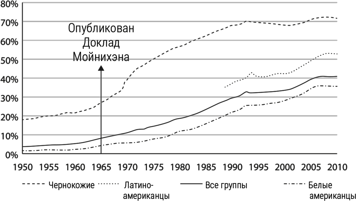 Процент внебрачных детей у чернокожих вдвое больше, чем у белых, и за последние 50 лет этот показатель резко вырос у всех групп населения.