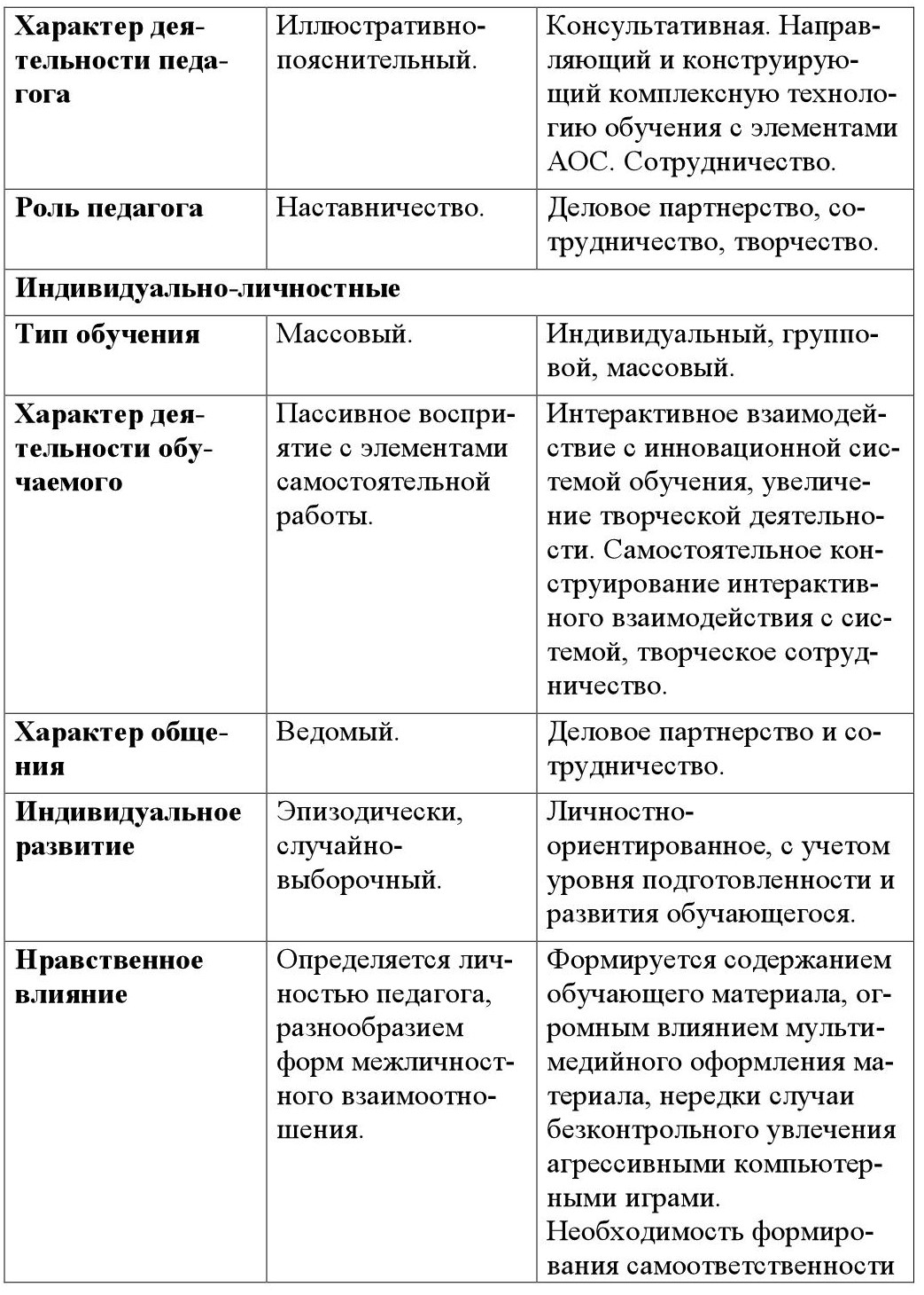 Из представленного сопоставления технологий обучения видим, что необходима разработка новой парадигмы образования на основе современных информационных и коммуникационных технологий. Для разработки и внедрения новой модели образования необходимы коренные изменения в организации обучения, создание новых средств обучения. Большие надежды педагоги возлагают в этом вопросе на новые очень мощные функциональные возможности компьютера, сетевых технологий взаимодействия и передачи информации. Но самым главным условием эффективности использования современных информационных и коммуникативных технологий является воспитание личности, его чувства ответственности за свой уровень образования и культуры, чувства собственного достоинства.