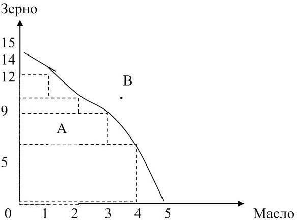 Между этими крайними вариантами возможны другие варианты, когда, отказавшись от производства некоторого количества масла, можно будет соответственно увеличить производство зерна. Возможный выбор вариантов показан в шкале производственных возможностей.